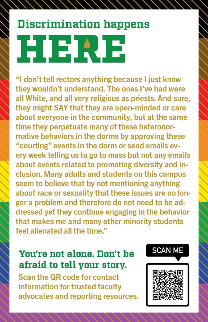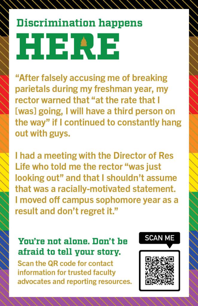 (It is recommended that students seek out faculty or staff to talk through their experiences and/or receive support in filing a report. Please also note that even with the Trump administration’s changes to Title IX, Notre Dame has elected to keep all faculty as mandatory reporters in instances of blatant discrimination, harassment, etc. except for counselors at the UCC, healthcare providers at UHS, and vowed religious people serving specifically in their role as clergy members.)
