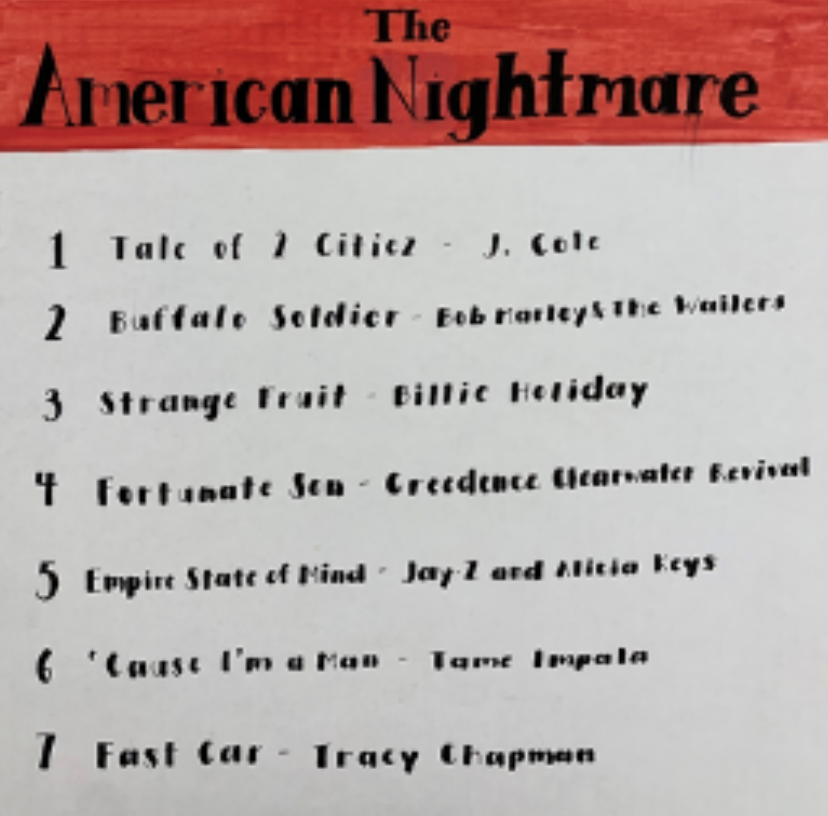 Our first song is “Tale of 2 Citiez” by J. Cole which we felt most clearly connected to the playlist’s name “The American Nightmare.” On this track, J. Cole raps about how the American Dream is not easily achievable for all Americans, especially those who are poor, racial minorities, and live in the inner city. In the first verse, Cole reveals that since he was young he “always dreamed of gettin’ rich” and “fantasized about a white picket fence” which is directly related to Cullen’s chapter 5 that discusses the “Dream of Home Ownership” (2, 3). Although Cole has dreams that are common in American culture, throughout the song he finds himself seemingly forced to choose violence and crime as a means to advance economically. When trying to rationalize robbing someone for their “nice watch,” Cole asks, “Can you blame a nigga that ain’t ever had things?” which produces sympathy from listeners for poor people who resort to crime to make money (2). Furthermore, in the bridge, Cole says, “I know that everything that glitters ain’t gold / … / But tell me till you get it how could you know” to showcase that because poor people do not know what it is like to have wealth, they are willing to go to extreme, even illegal and immoral, lengths to advance themselves (2). “Tale of 2 Citiez” is the perfect song to start our playlist because it immediately shows listeners that the American Dream is more of a nightmare than a dream for many Americans.