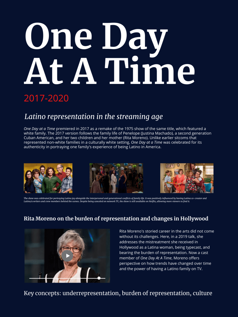 - One Day At A Time (2017). This family sitcom provides a contemporary example of representations of the family and privileges the Latino/a perspective. This is a key text to include in the exhibit for several reasons. First, it is a remake of the 1975 One Day At A Time, which featured a white family, and thus illustrates how today’s family sitcoms can represent the increasing diversity of the American family while still addressing evergreen themes. However, while the themes may be similar, One Day At A Time is a distinctly Latino show that incorporates Cuban cultural influences, while also directly addressing the struggles and triumphs associated with the family’s experience of being Latino. To illustrate this point, I would use a clip from Elena’s quinceañera, which was a site of generational, gendered, and racialized conflict among the characters. The portrayal of Latinidad represents a departure from Julia and The Cosby Show, which have both been criticized for being assimilationist (2). For additional source material, this module utilizes interviews with actors and addresses the burden of representation through listening to Rita Moreno. I will use clips from Moreno’s 2019 talk at Notre Dame, where she addresses the challenges of coming up in Hollywood as a Latina woman, being typecast, and bearing the burden of representation. During the talk, she said, “Now, we have to get better representation for Latinos, which we don’t have in Hollywood and especially in films. I think we are under-represented…The door is somewhat open, but we still have a long way to go,” (12). Her first-person perspective as a cast member of One Day At A Time who has also experienced negative representations would provide insight into how trends have changed over time in ways that now allow the family sitcom to represent a Latino family.